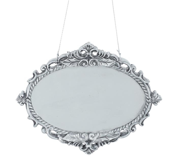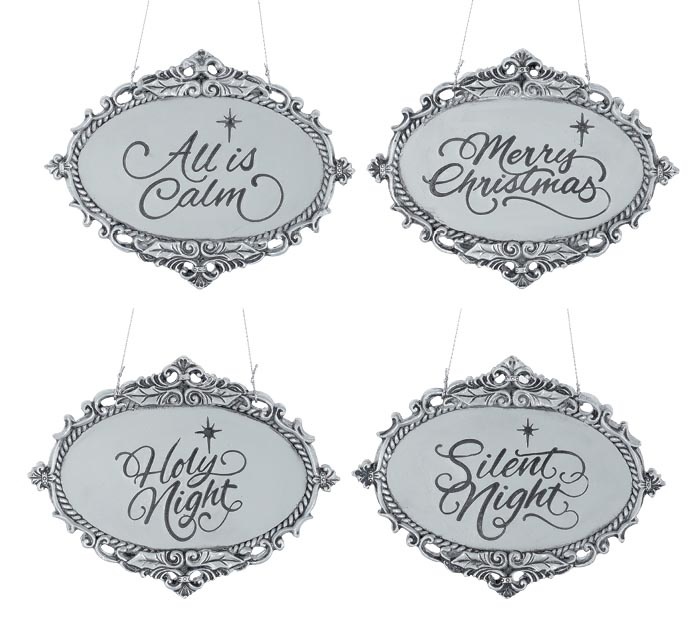 Ornaments have scrolled holly edging with recessed messages in navy blue. Messages include: All is Calm, Merry Christmas, Holy Night Silent Night. Silver cord hanger included.