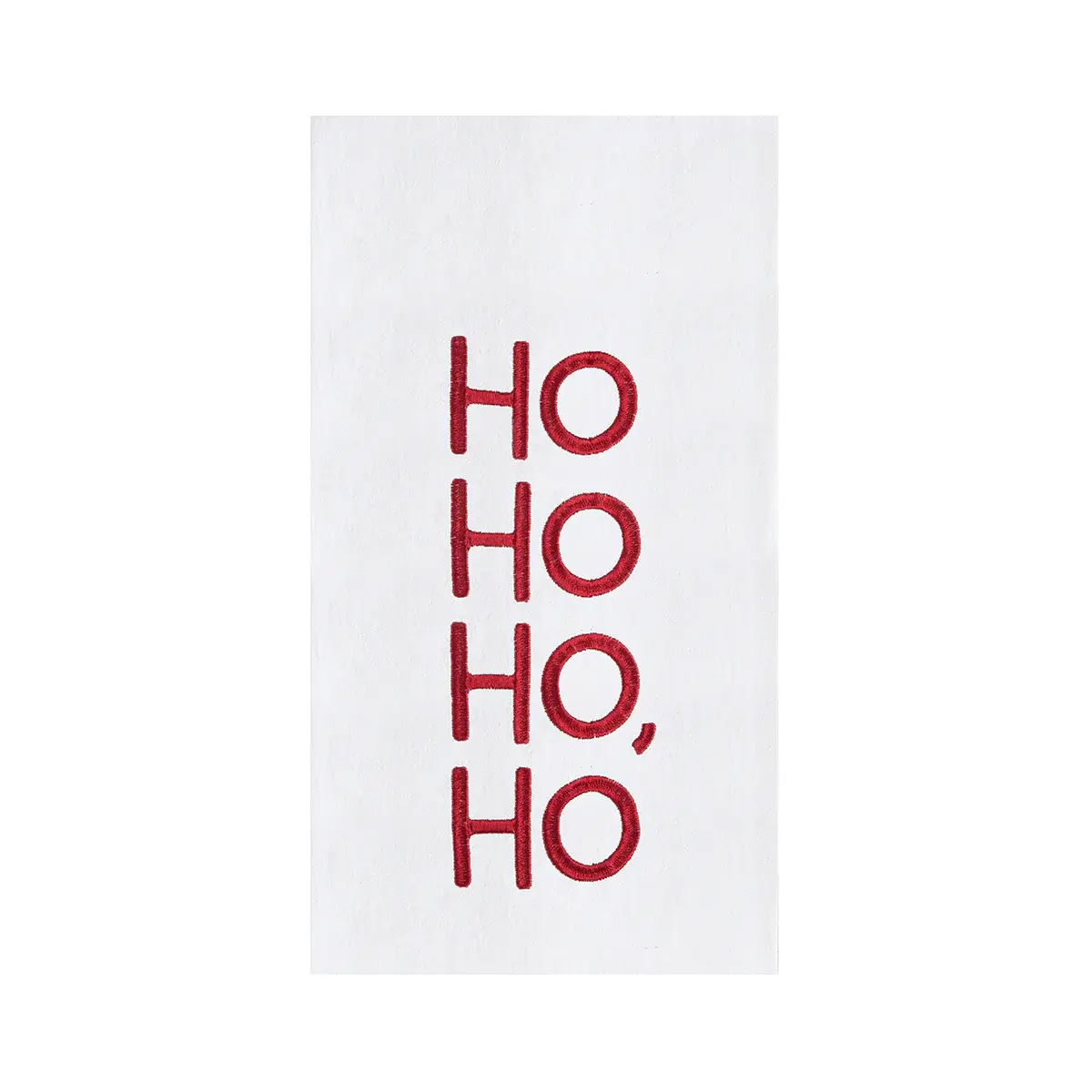 Festive and simple, the HO HO HO Flour Sack Kitchen Towel depicts text of Santa's signature jolly laugh in bright red letters. This cheerful towel makes any kitchen merrier.