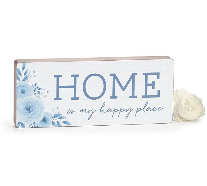 White hand-painted wooden shelf sitter with light blue flowers and dark blue message. Message reads: "Home is my happy place."