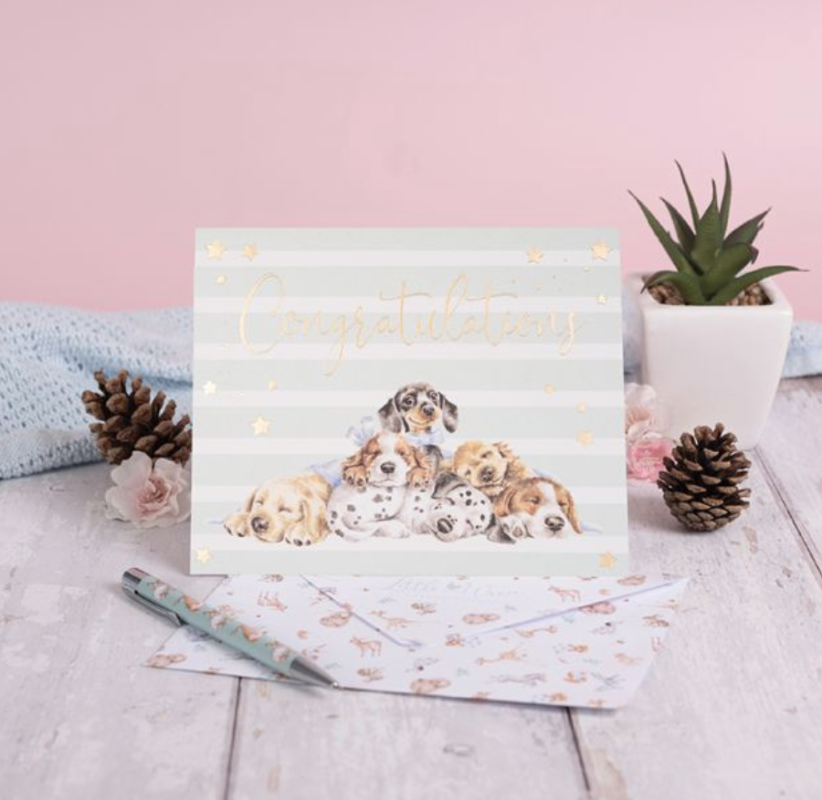 Celebrate the arrival of a new baby with this gorgeous card featuring sleepy puppies. Printed on high quality, sustainably sourced textured board from responsibly managed forests. Inside reads 'Congratulations'.