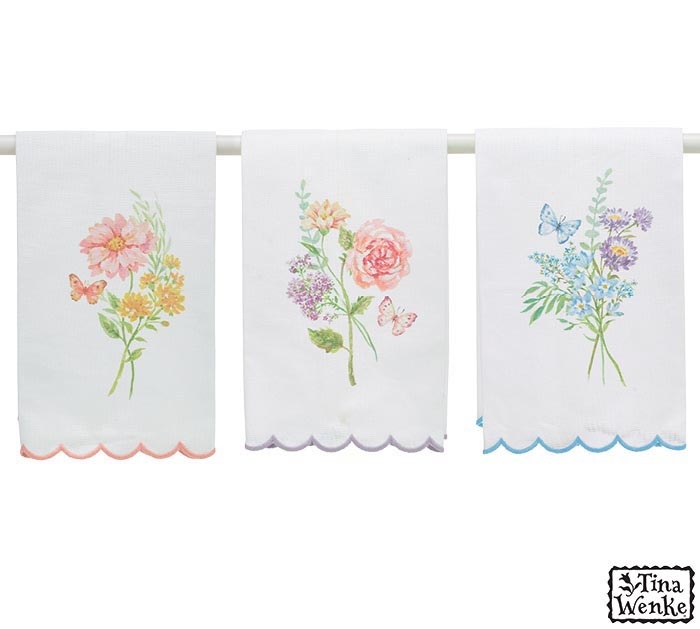 White tea towel with scalloped border, each has a different floral bouquet with a butterfly in shades of peach, blue, and pink. Borders are in peach, blue, and purple.