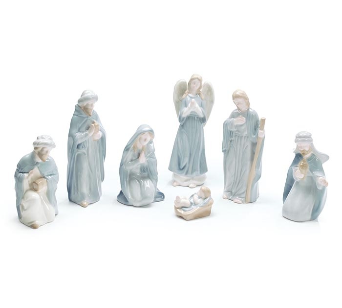 7-piece light blue, dark blue, and white ceramic nativity set.