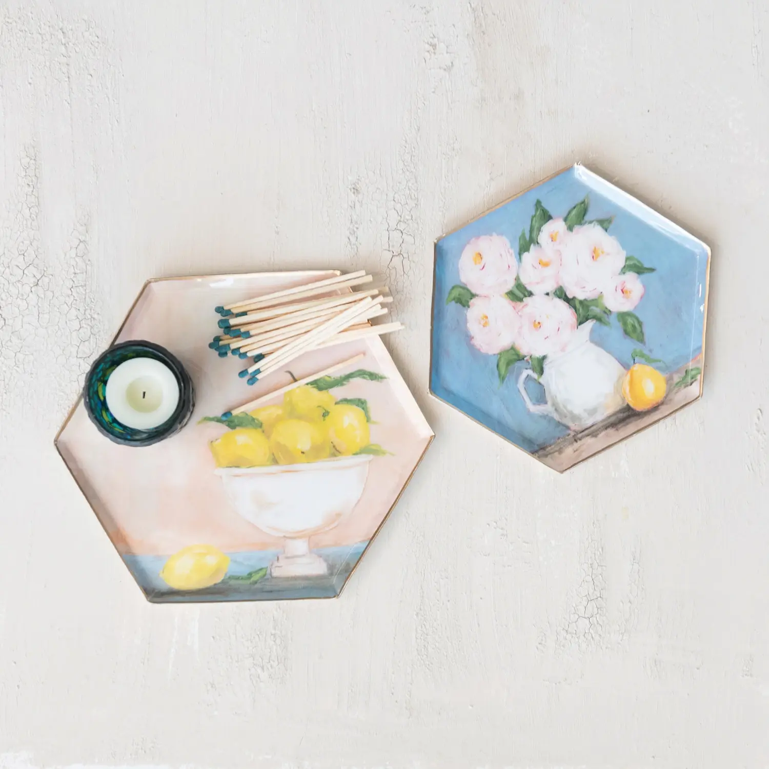 9-1/4"L x 8"W & 7-3/4"L x 6-1/2"W Hexagon Enameled Metal Trays w/ Lemons in Bowl/Flowers in Vase & Gold Edges,