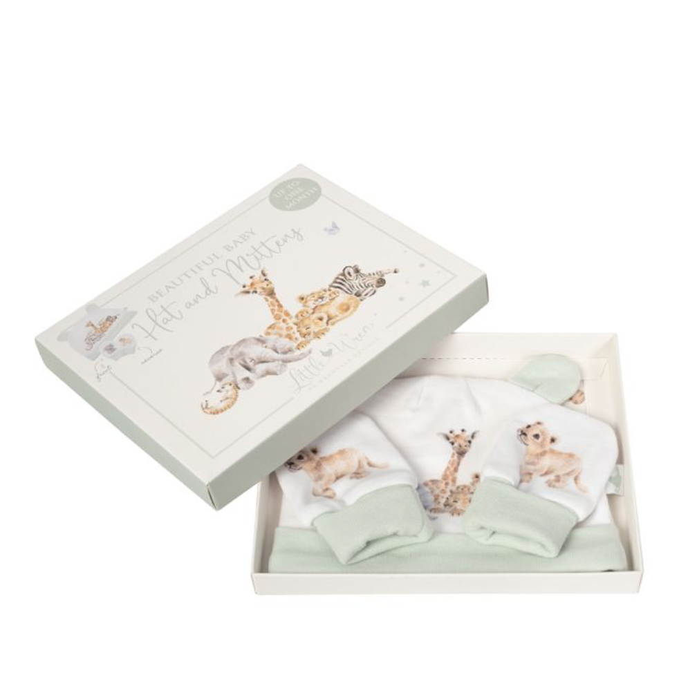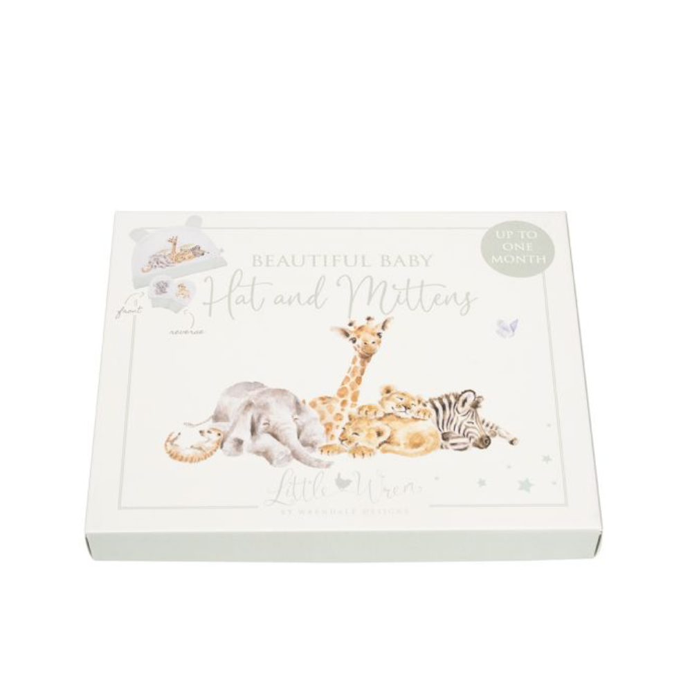 The perfect gift for a newborn or expecting parents, this super soft hat and mitten sets features our 'Little Savannah' design. The hat and mittens have a lovely soft feel and feature artwork on the front and reverse with complementary coloured trim and ears on the hat. Presented in a beautifully illustrated gift box. Explore matching items in our Little Wren collection. One size. Suitable up to 1 month. 100% cotton, cuffs 98% cotton 2% elastane. Box made from sustainably sourced board from responsibly managed forests and measures 7 x 6 x 0.8 inches.