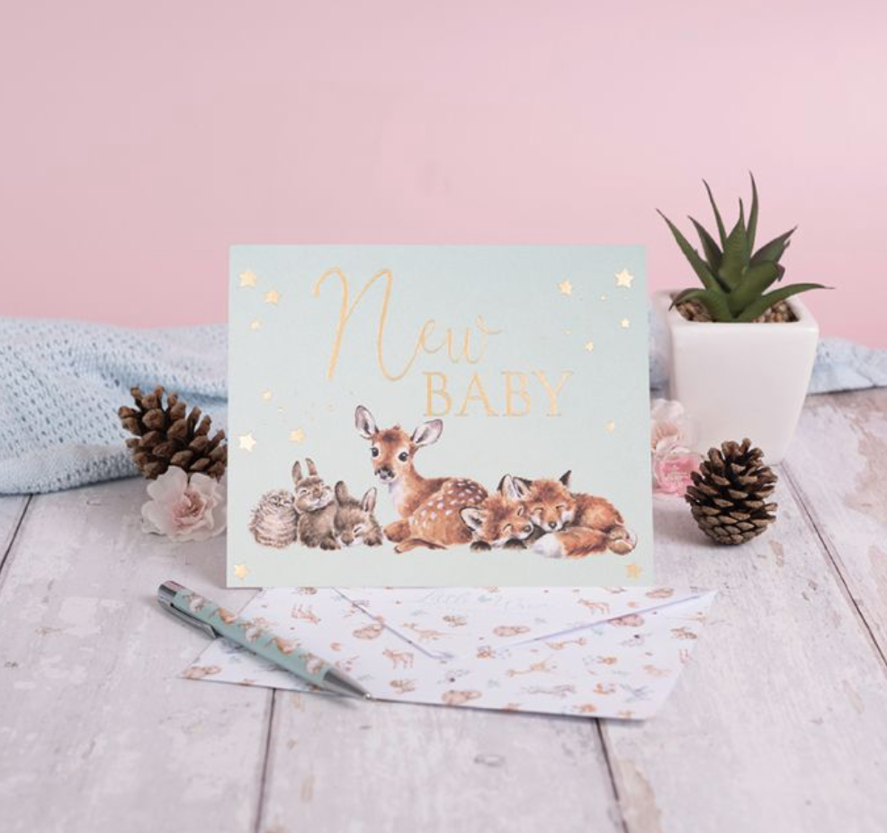 Celebrate the arrival of a new baby with this gorgeous card featuring woodland animals. Printed on high quality, sustainably sourced textured board from responsibly managed forests.