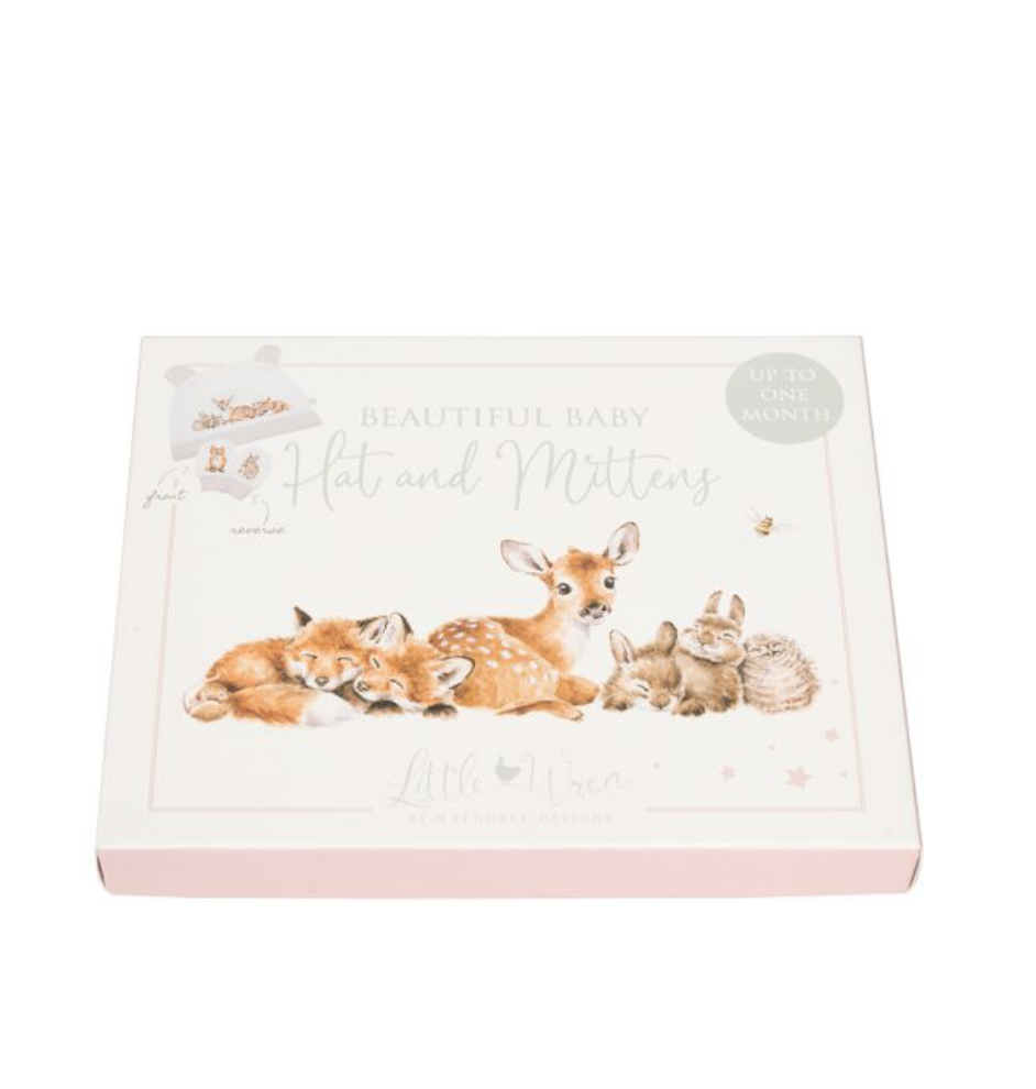 The perfect gift for a newborn or expecting parents, this super soft hat and mitten sets features our 'Little Forest' design. The hat and mittens have a lovely soft feel and feature artwork on the front and reverse with complementary coloured trim and ears on the hat. Presented in a beautifully illustrated gift box. Explore matching items in our Little Wren collection. One size. Suitable up to 1 month. 100% cotton, cuffs 98% cotton 2% elastane. Box made from sustainably sourced board from responsibly managed forests and measures 7 x 6 x 0.8 inches.