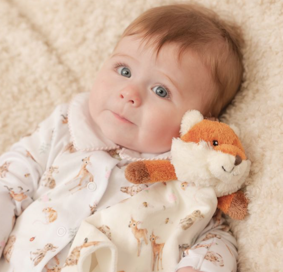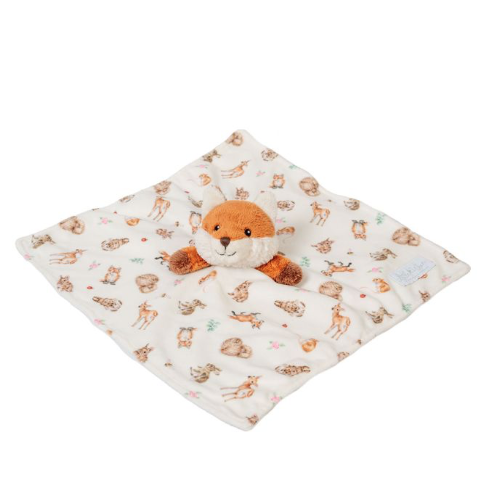 This super soft and cuddly comforter features a friendly fox face and a cosy blanket with coordinating forest animal pattern. It comes with a "To/From" gift tag, making it a perfect gift for a newborn or infant.