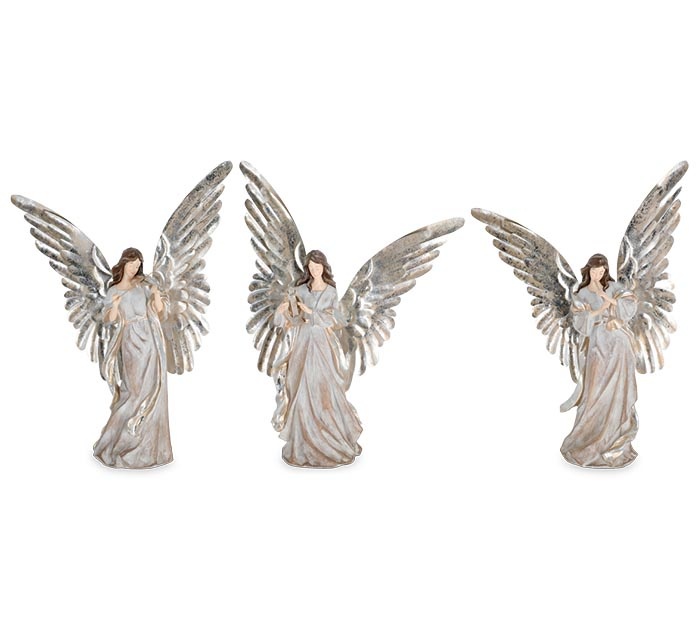 Your choice of 3 angels. Each angel has brown hair with gold accents and come in 3 poses: playing a horn, playing a violin and playing a harp. Made of hand-painted resin and shimmery tin wings.